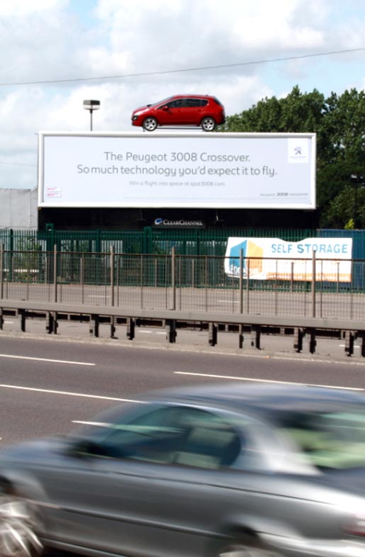 The Peugeot 3008 Crossover is being promoted in the UK as the car with so much technology you would expect it to fly. The campaign is centred around Peugeot cars appearing to have landed on tall buildings, special build poster sites, and on top of buses, backed up with broadcast, press, posters, radio sponsorship, test drives and an online panoramic view of London. 3008s have landed on significant high footfall buildings in London, Birmingham, Manchester, Glasgow and Bristol. Peugeot 3008 vehicles are on display in Westfield, Bull Ring, Trafford, Silverburn and Cabbot’s Circus shopping malls, with a bus (Peugeot 3008 attached) driving around each venue promoting test drives and competition entries.