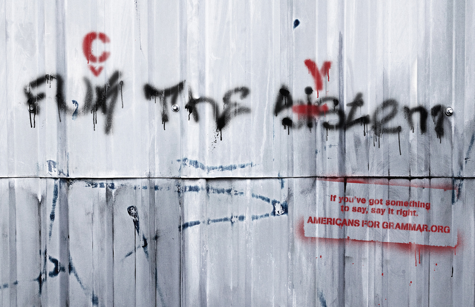 The objective of this project was to create a movement for all Americans to stand up and take control of (and call out) a growing problem: Poor grammar. We see it everyday: In Facebook posts, in emails, memos…and graffiti tags on the street. The print ads drive to a blog where people can post their own found mis-tags, as well as donate money to an urban language and grammar school. We used grammatically incorrect graffiti as our example in print ads because they are the most visible example out in public. The print ads drive to a blog, Americans for Grammar.org, that is a growing collective of misspelled and grammatically incorrect tags around the country that encourages Americans that find misspellings and post pictures themselves.