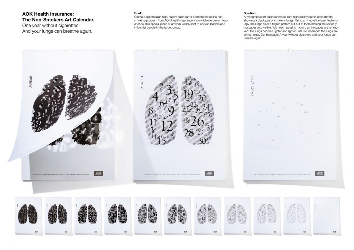 Solution: A typographic art calendar made from high quality paper. each month showing a black pair of smokers lungs. Using an innovative laser tech-no- logy. the lungs have a filigree pattern cutout of them making the underlying pages also With each passing month, as the pages are re-mo-ved, the lungs become lighter and lighter until, in December, the lungs are almost clear. Our message: A year without cigarettes and your lungs can breathe again.