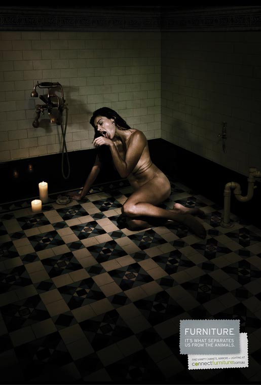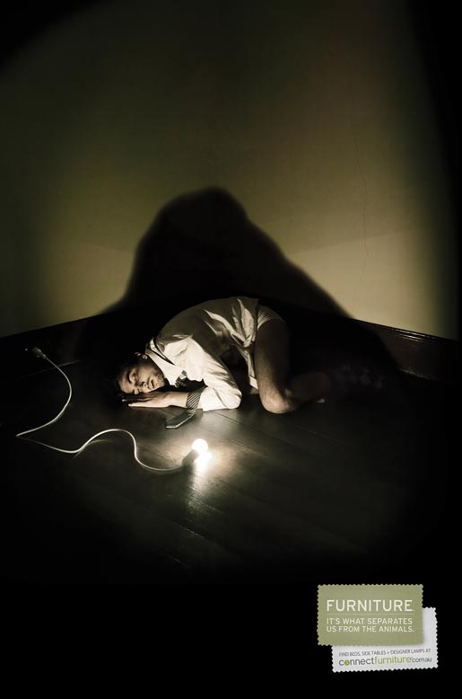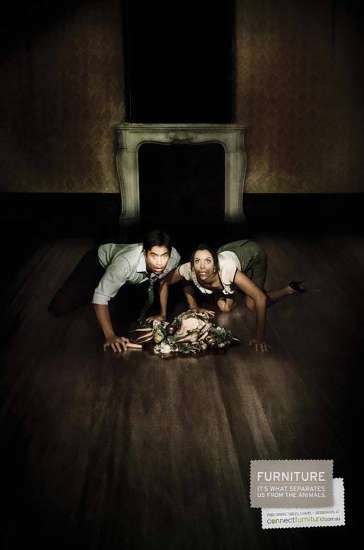 Connect Furniture in Australia is running a new press, outdoor and point of sale advertising campaign with the tag line, “Furniture. It’s what separates us from the animals”. The campaign celebrates the role of furniture in the dining room, bedroom and bathroom, by giving a little glimpse into a life without it.