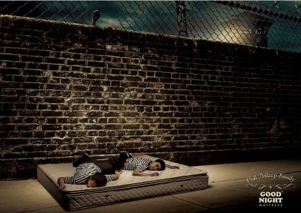 The J&J advertising agency of Shanghai, China, staged these amusing prints with bed cushions in unexpected places. One has been positioned at the base of a jail wall, and the other just inside an open window of a house. On the first bare mattress, two escaped prisoners are passed out, and in the second ad a thief is also unconscious. The scenes suggest that the perpetrators were overcome with fatigue the moment they made contact with each comfortable pad. These Good Night Mattress ads assert that you will “Fall asleep immediately,” so it seems this robber and these convicts need to rethink their entry and exit strategies—should they get second chances.