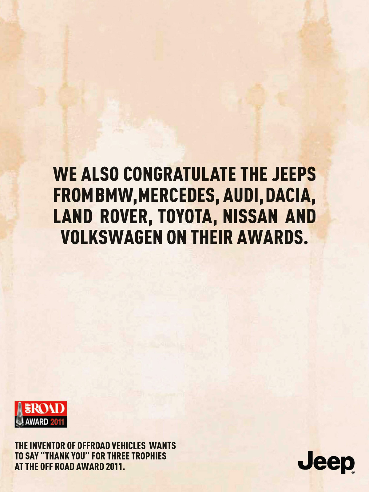 We also congratulate the Jeeps from BMW, Mercedes, Audi, Dacia, Land Rover, Toyota, Nissan and Volkswagen on their awards. The inventor of offroad vehicles wants to say “thank you” for three trophies at the off road award 2011.”