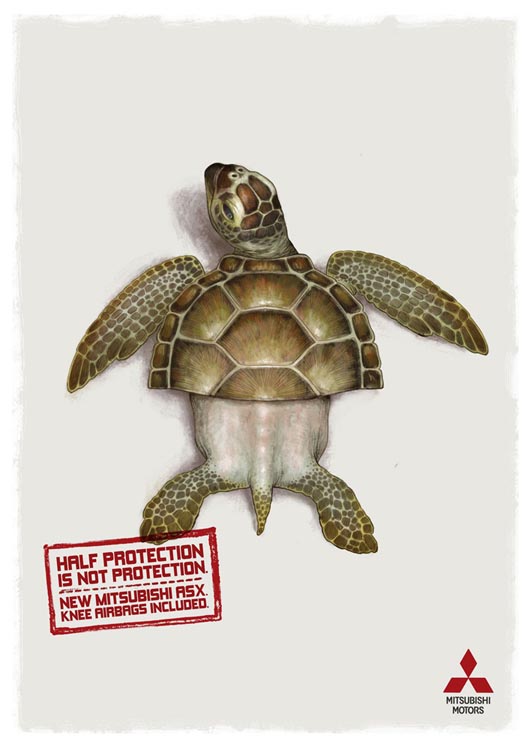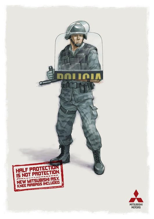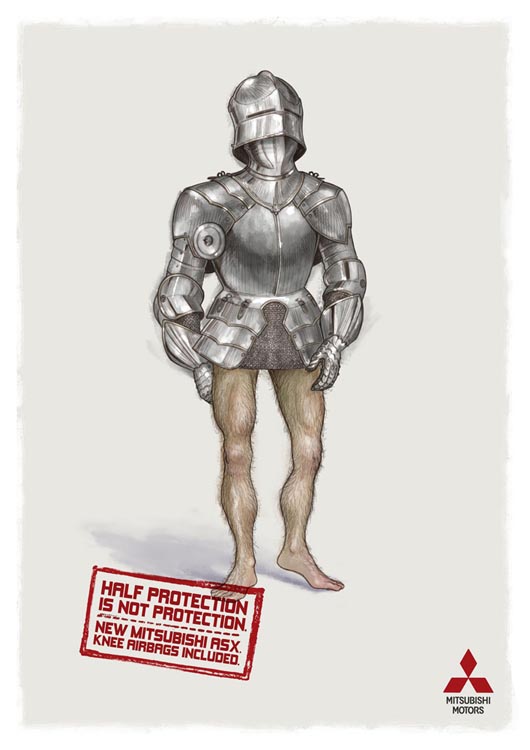 Mitsubishi Brazil is promoting the safety features of the new Mitsubishi ASX with a print advertising campaign with the tag line, “Half protection is not protection.” “New Mitsubishi ASX. Knee Airbags included.” The ASX comes standard with dual front airbags, side airbags, head-protecting side curtains and knee airbags.