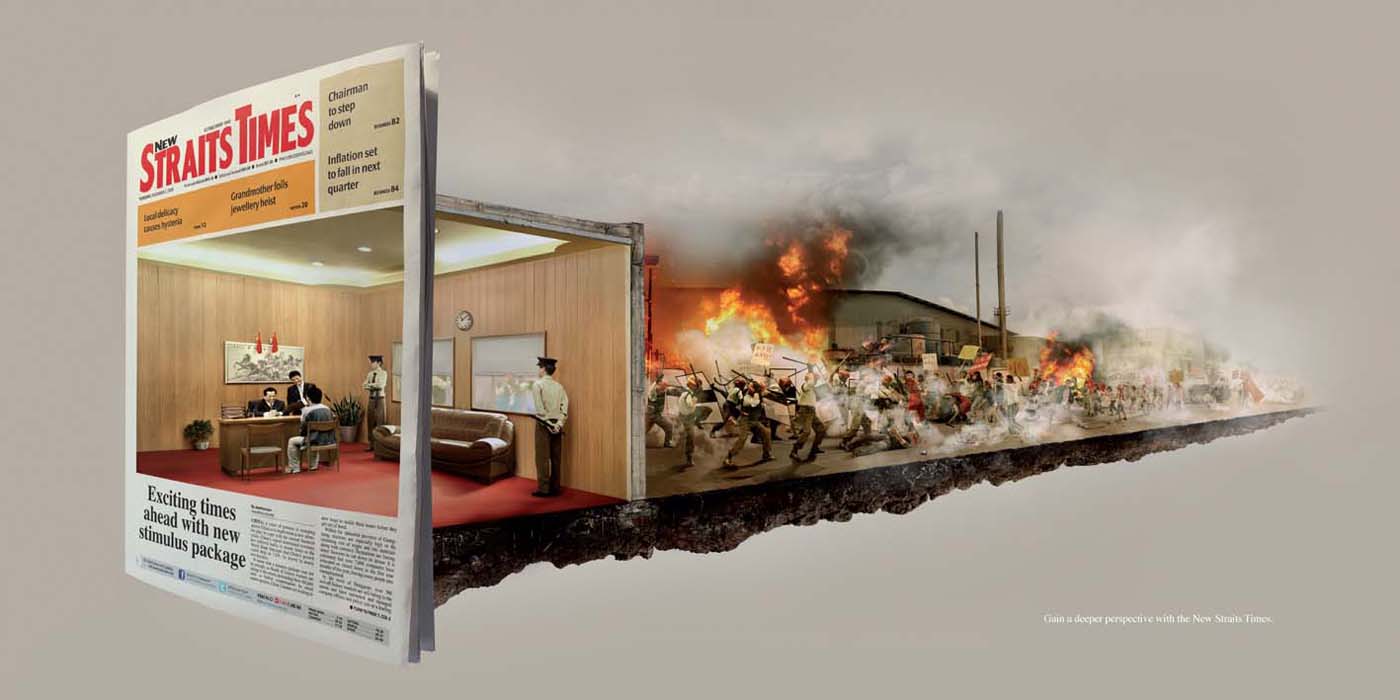 The New Straits Times Behind The Scenes campaign was developed at McCann Erickson Malaysia, Petaling Jaya, Malaysia, by executive creative directors Ean-Hwa Huang and Szu-Hung Lee, creative director/copywriter/ art director Jules Tan, art director Jerome Ooi, copywriter Benjamin Ng, photographer Loh Lin Shan at ImageRom, computer artists Soon and Byee, account supervisor Andrew Pinto, account manager Alexis Young, working with New Straits Times Press marketing director Zuraida Mohamad.