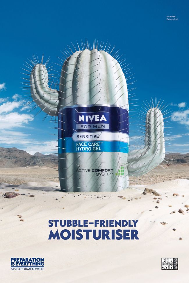 At last there’s a moisturiser for men who like a bit of stubble but want to avoid dry skin…what better way for DraftFCB,London to dramatize the benefits and the packaging for this launch than a cactus in a desert?