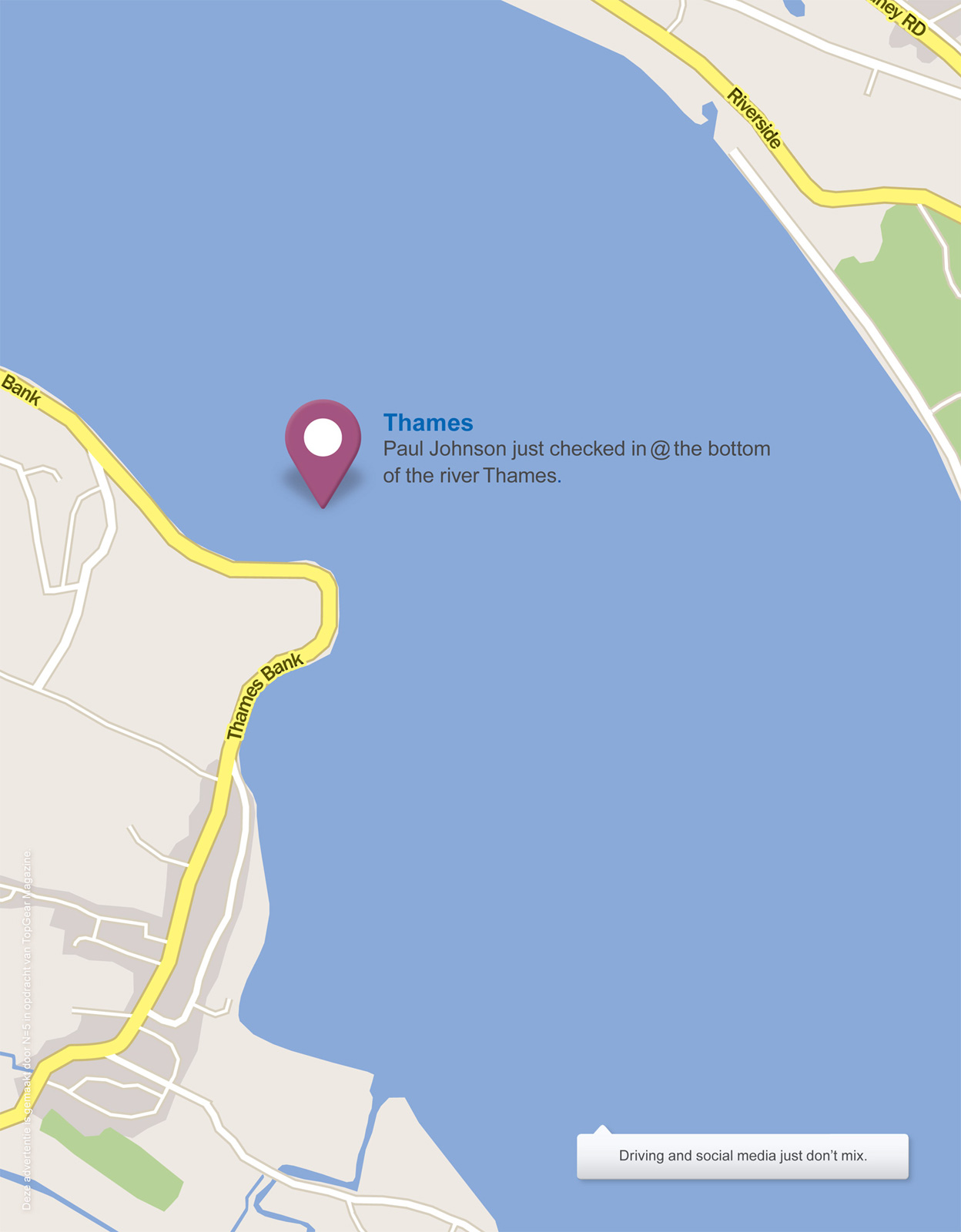 “Thames. Paul Johnson just checked in @ the bottom of the river Thames. Driving and social media just don’t mix.”