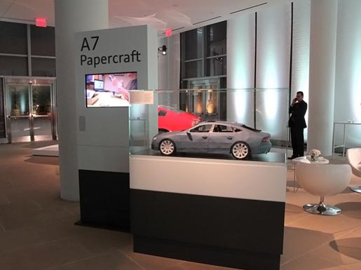 Audi of America launched the 2012 Audi A7 at the 2011 New York Auto Show with a 4 foot long papercraft replica made of paper. Graphic design artist Taras Lesko started this project with 285 clean sheets of paper. Using photos and A7 blueprints from Germany, he designed 750 model pieces out of card stock, which he then printed, folded and glued together. His equipment was a laser printer, two desktop cutting plotters, glue and an X-ACTO knife. More than 245 hours later, he had created his own bold vision. The stunt is connected with the Audi Bold Design Facebook application.